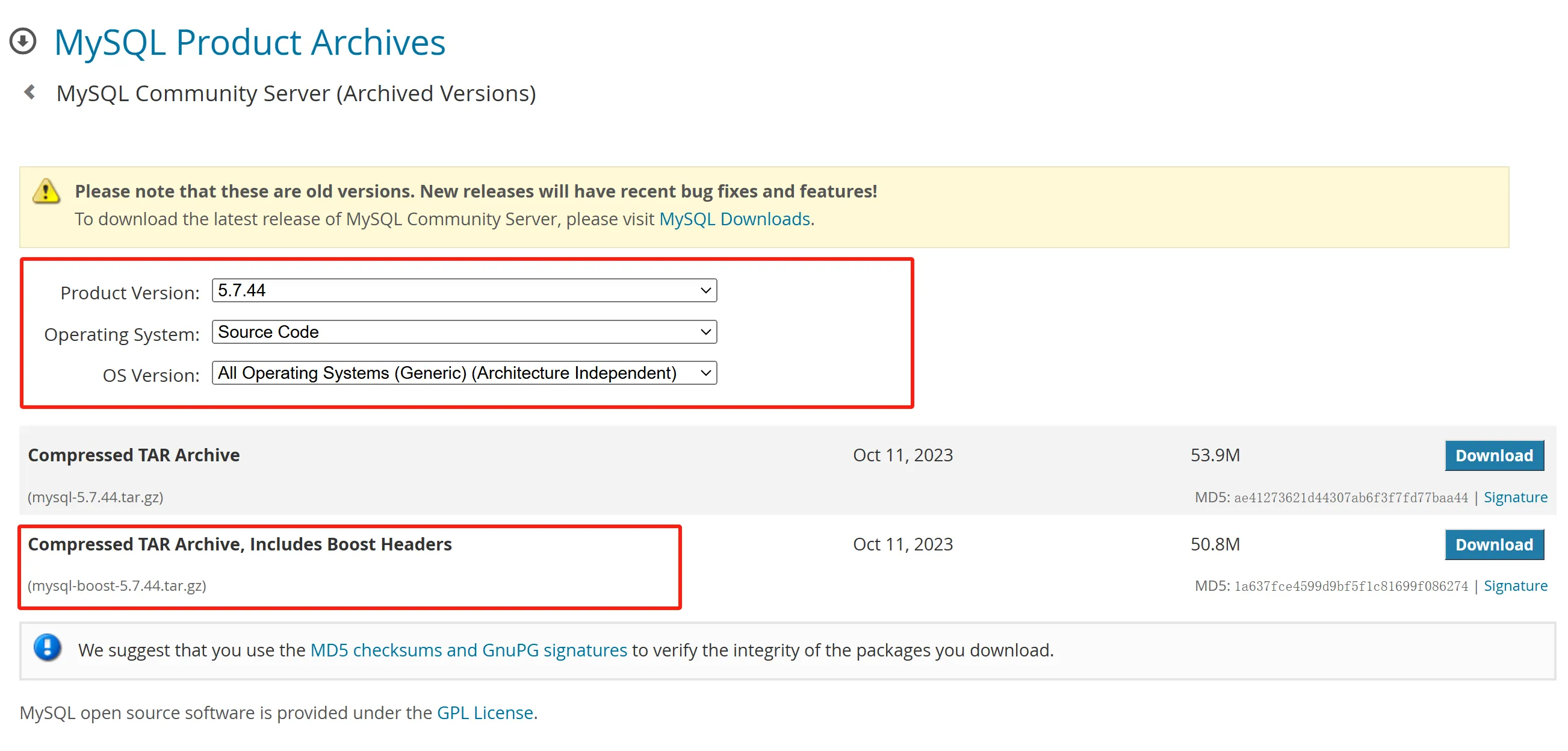 筛选出要下载的版本,Product Version选择5.7.44,也就是最后一个小版本,Operating System选择Source Code,OS Version选择All,然后选择最后一个自带boost的MySQL源码包(mysql-boost-5.7.44.tar.gz),进行下载,并将下载到的源码包先放到服务器的/opt目录下。